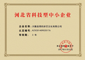 2017年7月22日,經(jīng)河北省科技廳審核評定,鄭氏砂藝文化有限公司被評為《河北省科技型中小企業(yè)》。這是繼2013年后,我公司再次獲此殊榮。