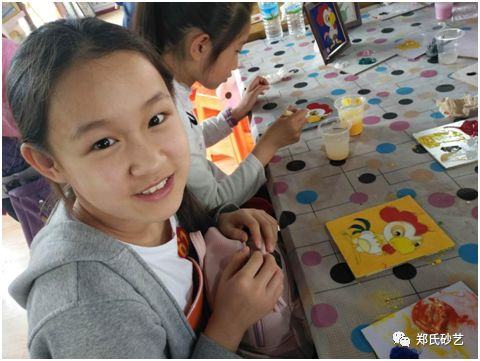 參觀后,五十余名同學(xué),自己動手體驗(yàn)描圖、粘絲、填砂等砂畫制作過程。