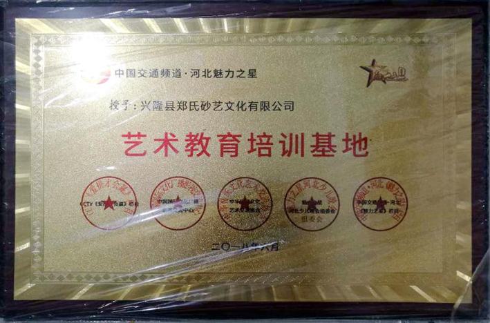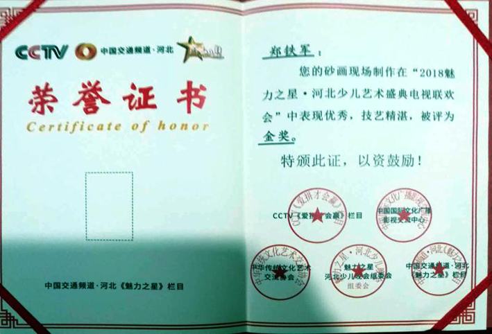 鄭氏砂畫制作榮獲“2018魅力之星河北少兒藝術(shù)盛典電視聯(lián)歡會”金獎,同時鄭氏砂藝文化有限公司被授予中國交通頻道·河北魅力之星“藝術(shù)教育培訓(xùn)基地”。
