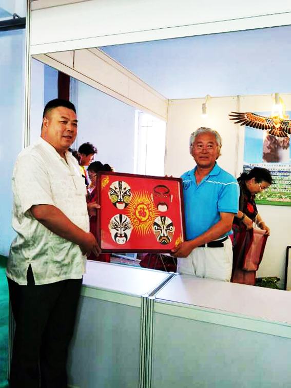 鄭氏砂藝總經(jīng)理鄭鐵軍捐贈(zèng)砂畫《組合臉譜》并與烏蘭察布市民間藝術(shù)家協(xié)會(huì)副主席肖占貴合影