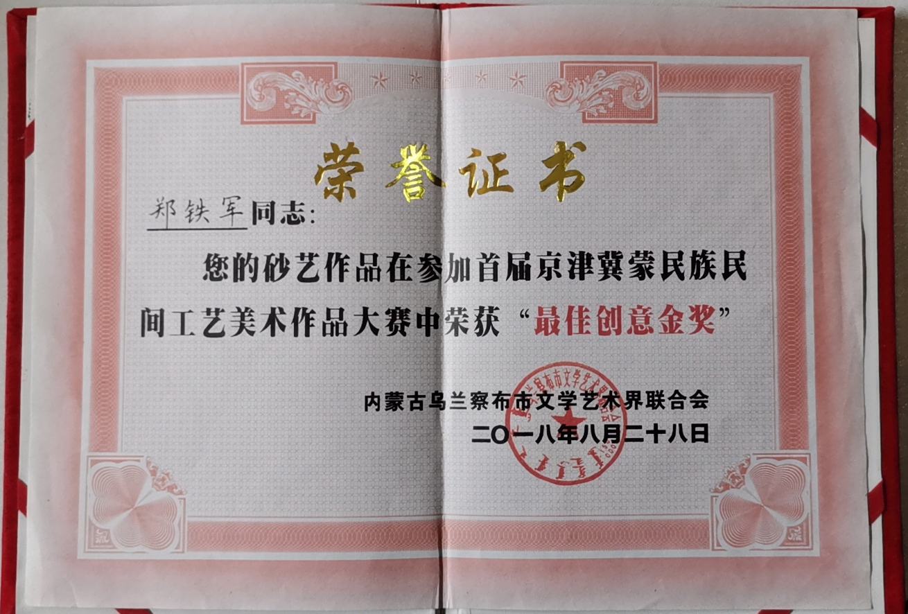 二〇一八年八月十七日至二十一日,烏蘭察布市首屆京津冀蒙民族民間藝術(shù)博覽會(huì)在內(nèi)蒙古自治區(qū)烏蘭察布市開幕。興隆縣鄭氏砂藝(畫)以承德市唯一一家省級非遺民間藝術(shù)產(chǎn)品出席開幕式并參展。在活動(dòng)中鄭氏砂畫藝術(shù)品受到社會(huì)各界人士一致好評,并榮獲首屆京津冀蒙民族民間工藝美術(shù)作品大賽“最佳創(chuàng)意金獎(jiǎng)”。
