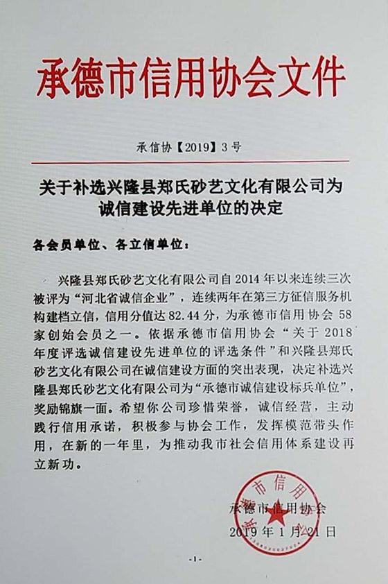 興隆縣鄭氏砂藝文化有限公司榮膺“承德市誠信建設(shè)標(biāo)兵單位”