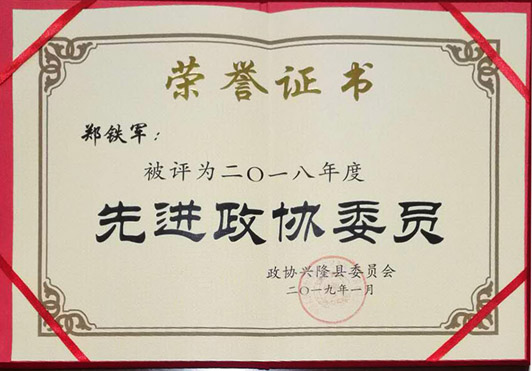 2019年1月政協(xié)興隆縣委員會為彰顯鄭鐵軍同志在2018年政協(xié)工作中的突出表現(xiàn),特向鄭鐵軍同志頒發(fā)《先進政協(xié)委員》榮譽證書!