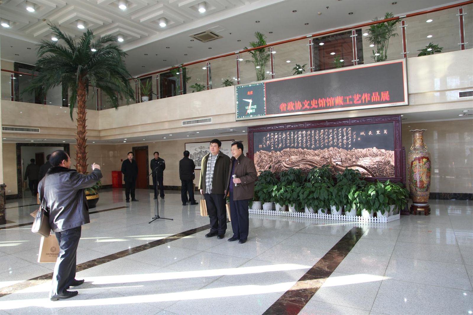 河北省文史館館藏作品展暨文史工作平臺建設(shè)座談會2013年12月29日在省會石家莊舉行??h政協(xié)主席劉海明、鄭氏砂藝公司總經(jīng)理鄭鐵軍、副總經(jīng)理方永成應(yīng)邀參加了本次活動(dòng)。座談會由省政協(xié)副主席曹素華主持,省政協(xié)主席付志方、省委常委、統(tǒng)戰(zhàn)部長范照兵、省委常委、宣傳部長艾文禮、副省長楊汭出席大會并做重要講話。省政協(xié)副主席段惠軍、崔江水、曹素華、 盧曉光、省政協(xié)秘書長郭大建以及省內(nèi)著名書畫家、藝術(shù)家近百人參加了參觀和座談會活動(dòng)。興隆縣鄭氏砂藝的《梅蘭竹菊》、《臉譜組合》、《青山疊翠》、《花鳥牡丹》共7幅作品被省文史館收藏。色彩靚麗的鄭氏金銀絲彩嵌砂畫,贏得了省領(lǐng)導(dǎo)以及與會專家學(xué)者的高度贊賞。