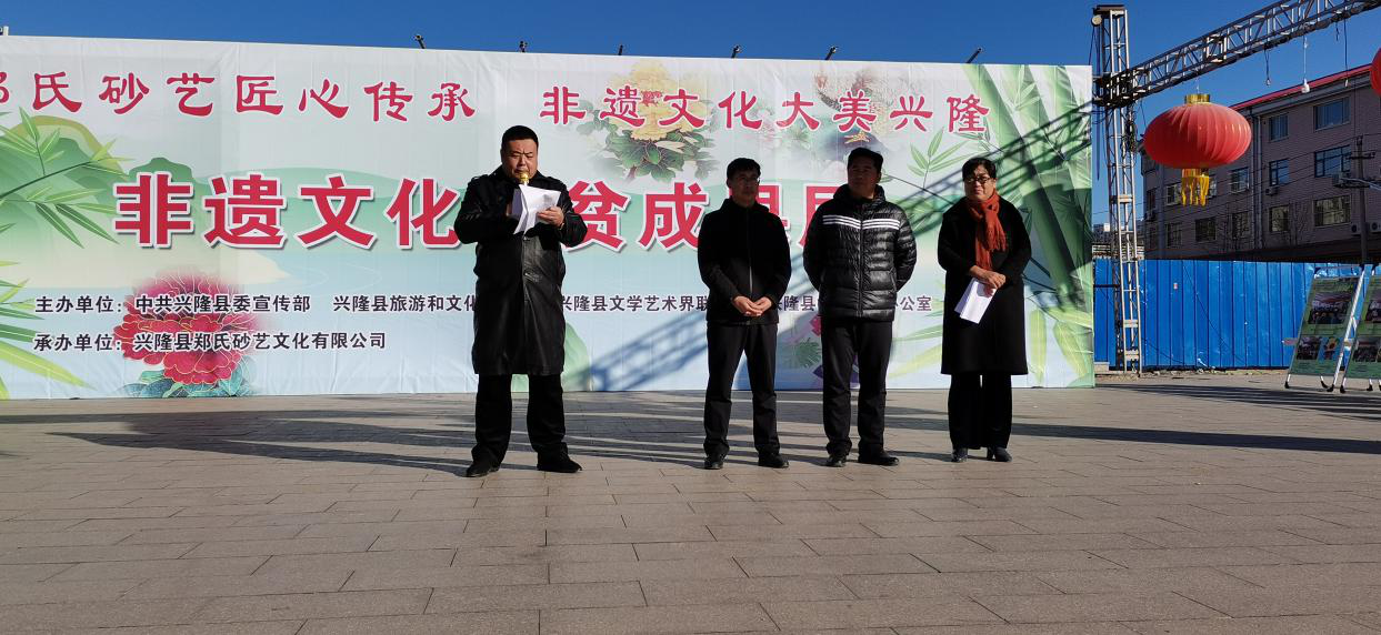2020年11月27日。由中共興隆縣委宣傳部、興隆縣旅游和文化廣電局、興隆縣文學藝術(shù)界聯(lián)合會、興隆縣扶貧開發(fā)辦公室主辦的、由興隆縣鄭氏砂藝文化有限公司承辦的《非遺文化扶貧成果展》在興隆縣中心廣場拉開帷幕。展會由興隆縣文學藝術(shù)界聯(lián)合會主席王久俠主持,鄭氏砂藝文化 有限公司董事長鄭鐵軍致開幕詞。文聯(lián)主席王久俠作重要講話。她說:“鄭氏砂藝是祖?zhèn)骷妓?,幾年來鄭氏砂藝積極開展非遺文化扶貧,培訓全縣400余名貧困婦女,制作出了具有飽含鄉(xiāng)土氣息,美輪美奐的砂藝作品。讓他們用巧手脫貧致富,為脫貧攻堅作出顯著貢獻?!彪S后縣委宣傳部常務(wù)副部長隋云鵬、縣旅游和文化廣電局黨委書記閆海濤、文聯(lián)主席王久俠由砂藝公司董事長鄭鐵軍、公司工會主席趙文紅等引導下,觀摩了“扶貧培訓成果展區(qū)”、“消費扶貧展區(qū)”、“貧困戶作品展區(qū)”及“愛心認購展區(qū)”。四區(qū)展介及作品。對鄭氏砂藝非遺文化扶貧成果給予充分肯定,并興致勃勃地欣賞了鄭氏砂藝美輪美奐的貧困戶作品。