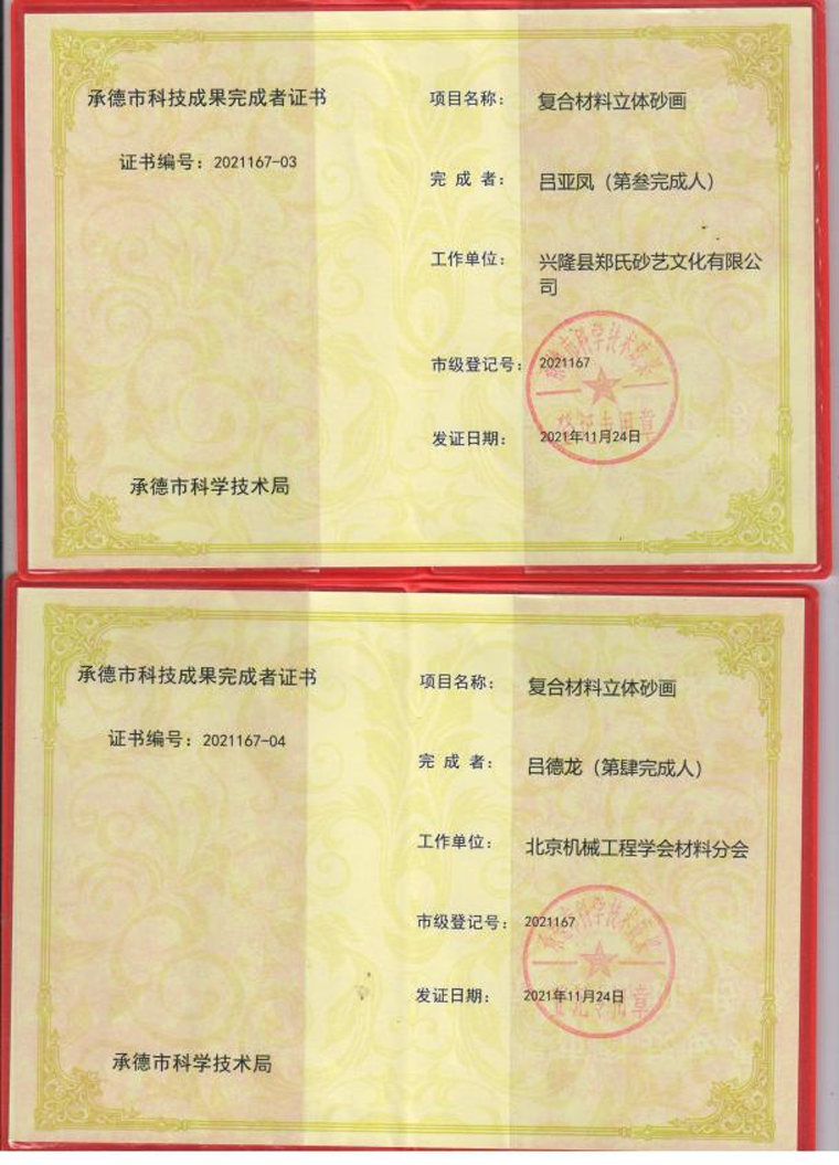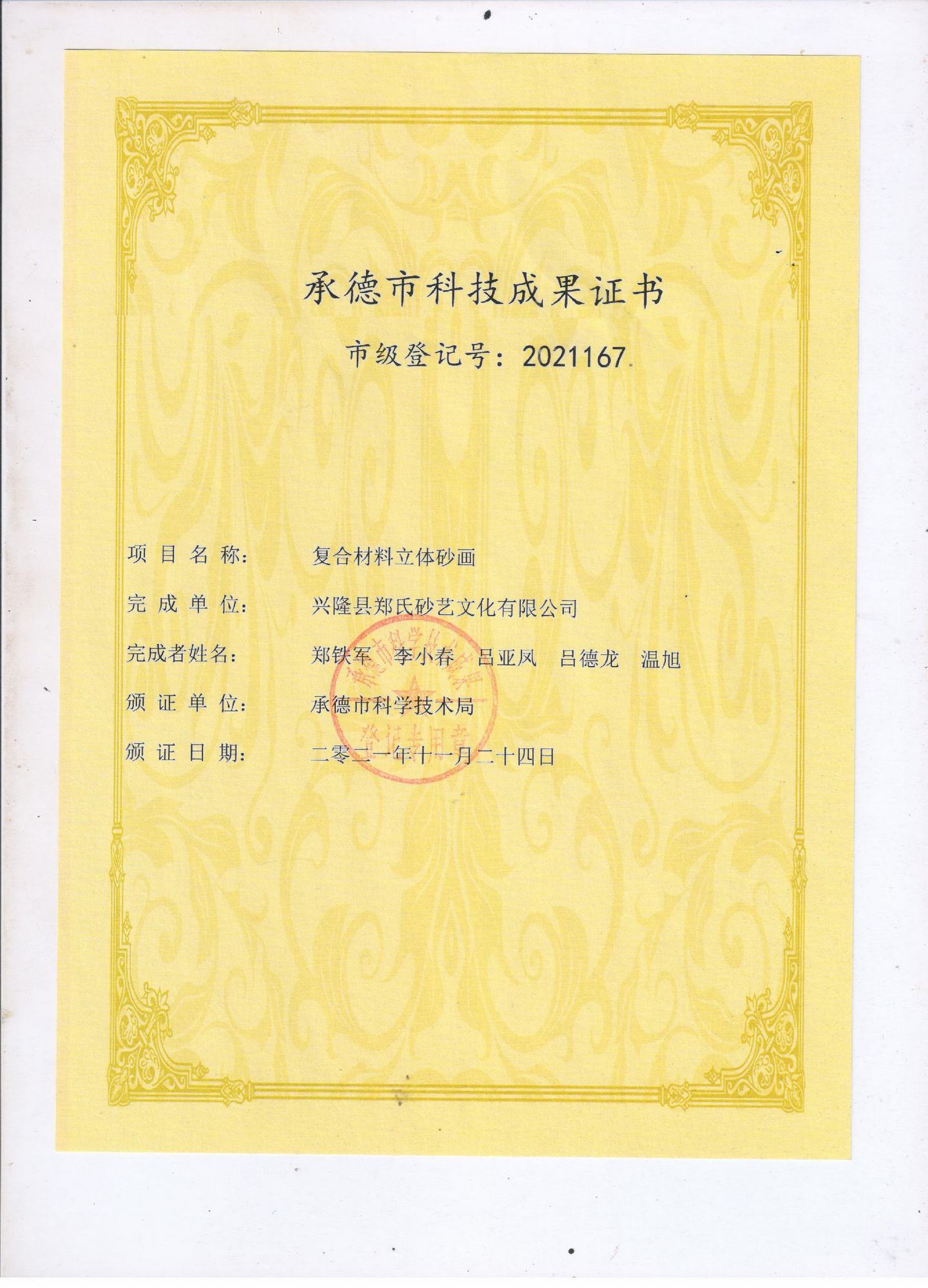 2021年11月24日,鄭氏砂藝圓滿完成了復(fù)合材料立體砂畫(huà)項(xiàng)目,獲得由承德市科技局頒發(fā)的《承德市科技成果證書(shū)》(市級(jí)登記號(hào):2021167),該項(xiàng)目課題來(lái)源于承德市科學(xué)技術(shù)研究與發(fā)展計(jì)劃,由我公司和北京機(jī)械工程學(xué)會(huì)材料分會(huì)共同完成。項(xiàng)目以天然彩砂和金屬絲為主要材料,畫(huà)面中加入其它復(fù)合材料(如山楂核、樹(shù)葉等),制成立體砂畫(huà),砂畫(huà)畫(huà)面采用透明樹(shù)脂壓膜技術(shù),保持彩砂畫(huà)面與膜不脫落,不褪色。通過(guò)該項(xiàng)目的研究,企業(yè)創(chuàng)新產(chǎn)品5個(gè)系列200多種作品,其中包括:砂畫(huà)木質(zhì)筆筒系列、水晶砂畫(huà)系列、砂畫(huà)手機(jī)殼系列、磁盤砂畫(huà)系列、活性炭砂畫(huà)系列,極大的提升企業(yè)產(chǎn)品質(zhì)量。