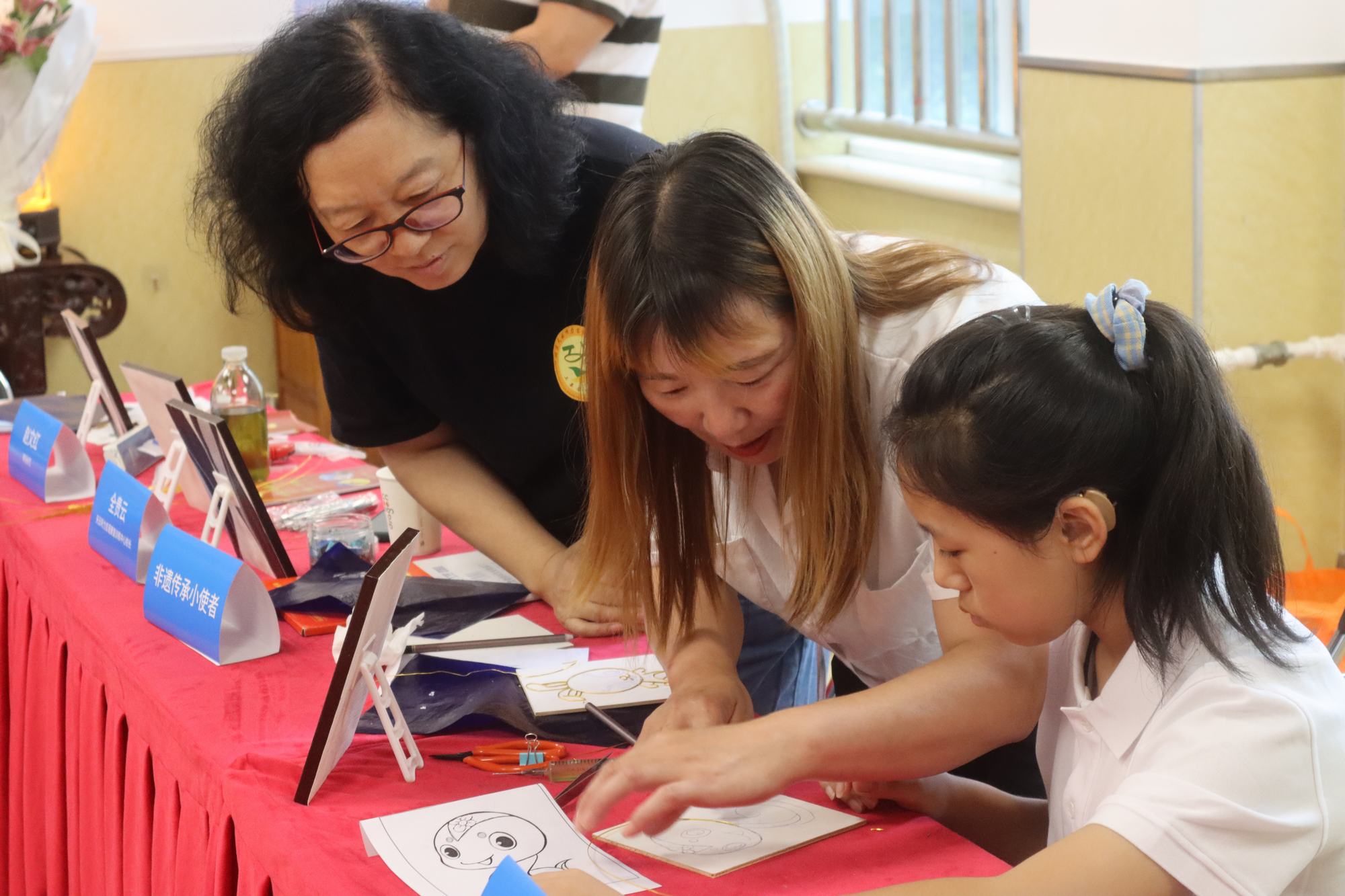 一把小小的鑷子和一個小小的鏟子,靈巧的將金屬絲和天然彩砂固定到木板上,隨著歡快的笑聲,一幅幅栩栩如生的砂畫作品呈現(xiàn)在眼前……