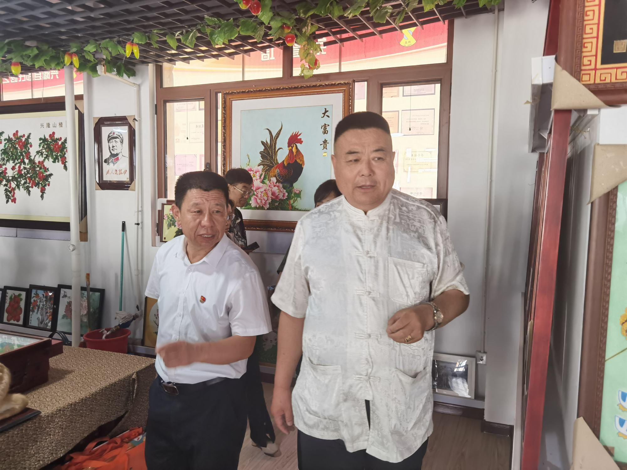 上午9時許,石俊鳳主席一行在鄭鐵軍主席的陪同下,參觀了鄭氏砂藝(畫)非遺博物館。博物館展出了鄭氏砂藝多年來在傳承和發(fā)展中的非遺砂畫精品3000余幅,這些作品能清晰地反映出鄭氏砂藝在不同時期的技術(shù)特點,同時也展現(xiàn)了鄭氏砂藝在非遺技藝和材料運用的不斷提升。參觀過程中,鄭鐵軍主席如數(shù)家珍般地向大家介紹了館內(nèi)藏品,這些作品有的被各大博物館收藏,有的被其他國家作為國禮收藏,有的獲得了國家級獎項等等。參觀結(jié)束后,石俊鳳主席表示:“鄭氏砂藝這些年的發(fā)展是有目共睹的,是承德市文化企業(yè)中發(fā)展較快、規(guī)模較大的,鄭氏砂藝的發(fā)展經(jīng)驗是值得我們學習和借鑒的,祝愿鄭氏砂藝在今后的發(fā)展中更上一層樓。同時鄭氏砂藝(畫)技藝是一項技術(shù)要求較高且畫面精美的非遺藝術(shù),非常值得大家學習和交流,增加大家對鄭氏砂藝非遺文化的了解”。