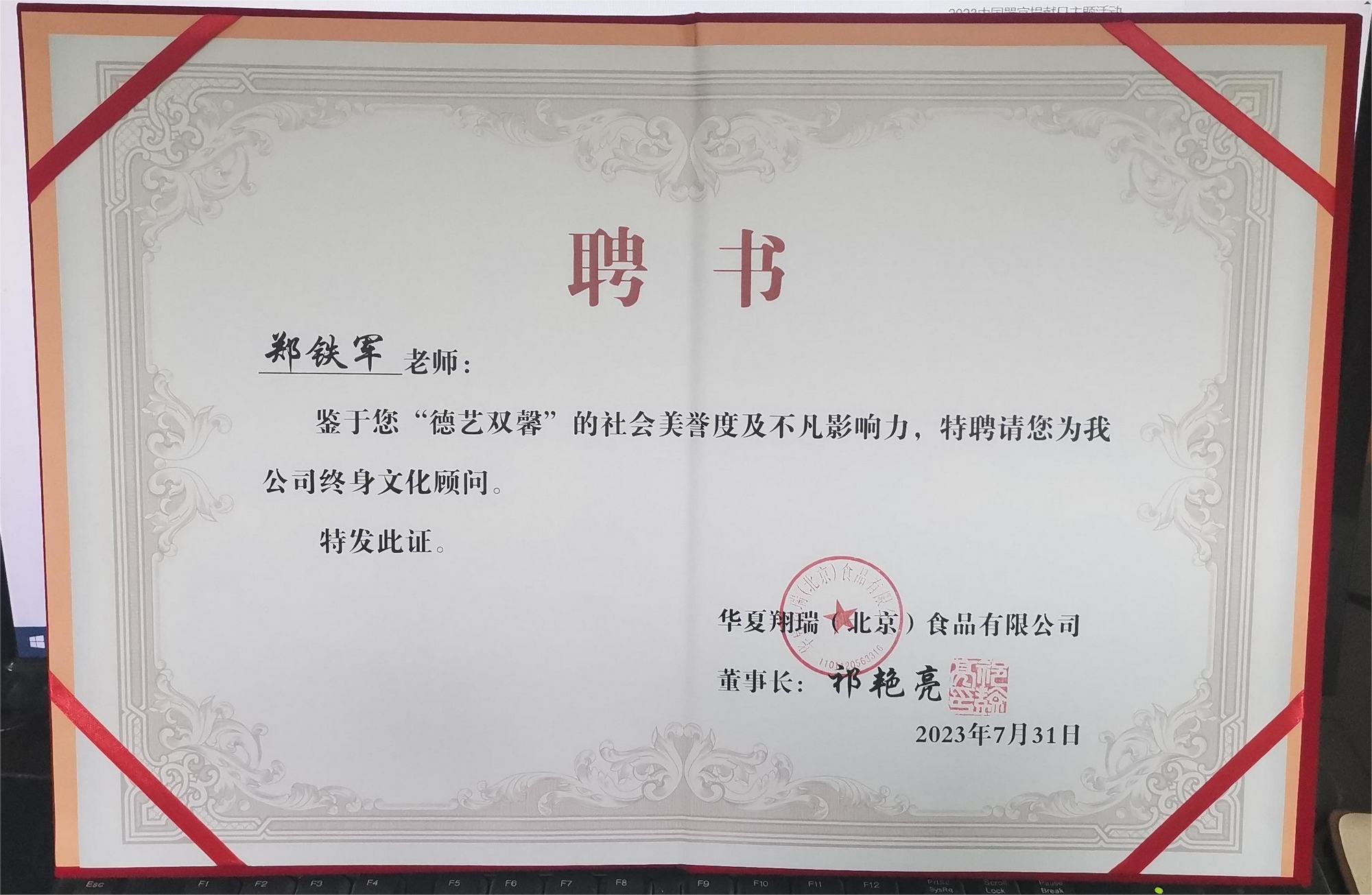 2023年7月31日,鄭鐵軍老師砂畫作品《牡丹》被華夏翔瑞(北京)食品有限公司永久收藏,同時(shí)鄭鐵軍老師被該公司聘為終身文化顧問(wèn)。