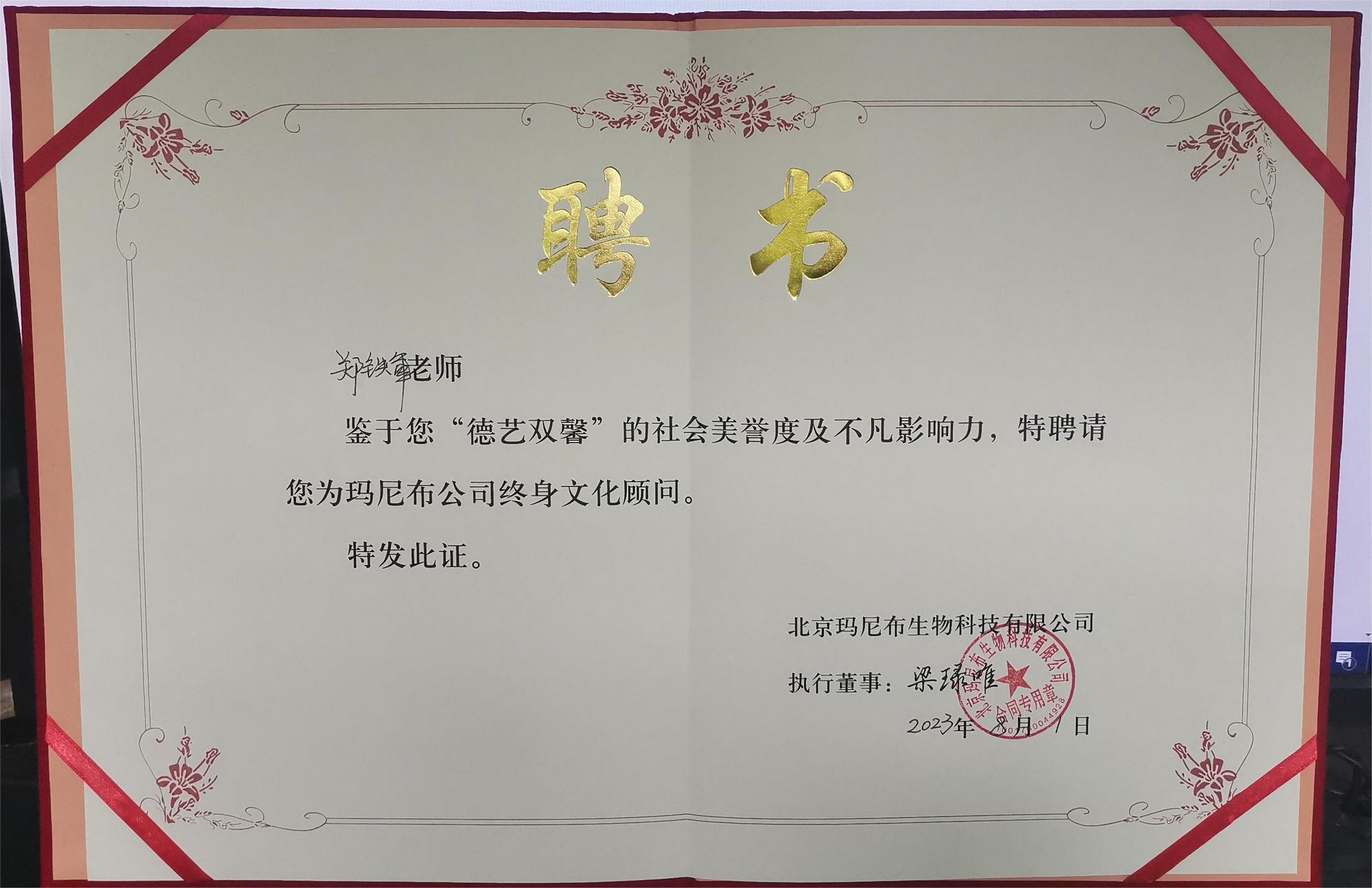2023年8月1日,鄭鐵軍老師砂畫作品《牡丹》被北京瑪尼布生物科技有限公司永久收藏,同時(shí)鄭鐵軍老師被該公司聘為終身文化顧問(wèn)。