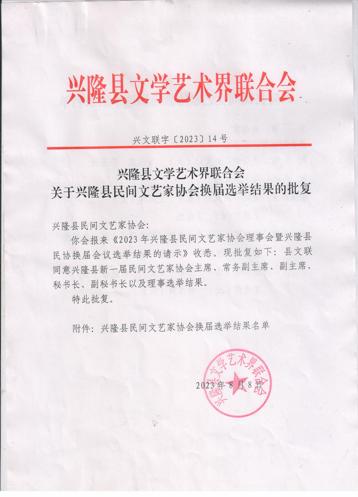2023年8月8日,興隆縣民間文藝家協(xié)會(huì)(簡稱興隆縣民協(xié))提交的《2023年興隆縣民家文藝家協(xié)會(huì)理事會(huì)暨興隆縣民協(xié)換屆會(huì)議選舉結(jié)果的的請(qǐng)示》獲興隆縣文學(xué)藝術(shù)家聯(lián)合會(huì)批復(fù),興隆縣民協(xié)組織機(jī)構(gòu)成員的批復(fù)如下:
