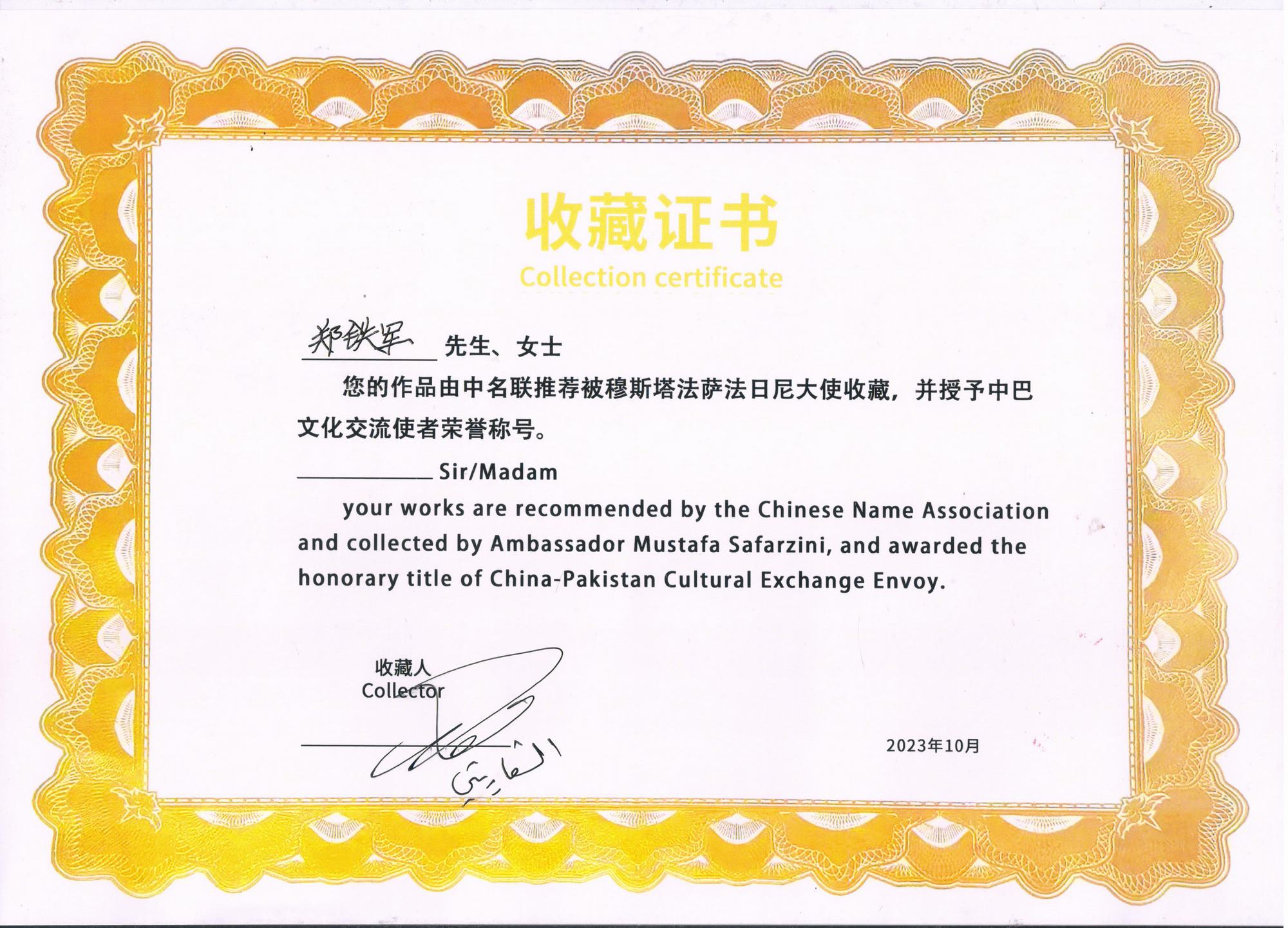 2023年10月29日,應中名聯(lián)邀請,并通過中名聯(lián)國際平臺,鄭氏砂藝執(zhí)行董事長鄭鐵軍同巴勒斯坦駐華大使穆斯塔法·薩法日尼展開了真摯而又熱情的交流,大使表示十分尊重和熱愛中國的傳統(tǒng)文化,尤其是高度贊賞了鄭氏砂藝(畫)在藝術方面達到的深厚造詣,并將鄭鐵軍砂畫作品《牡丹》選作國禮正式收藏,同時授予鄭鐵軍為中巴文化交流使者榮譽稱號。