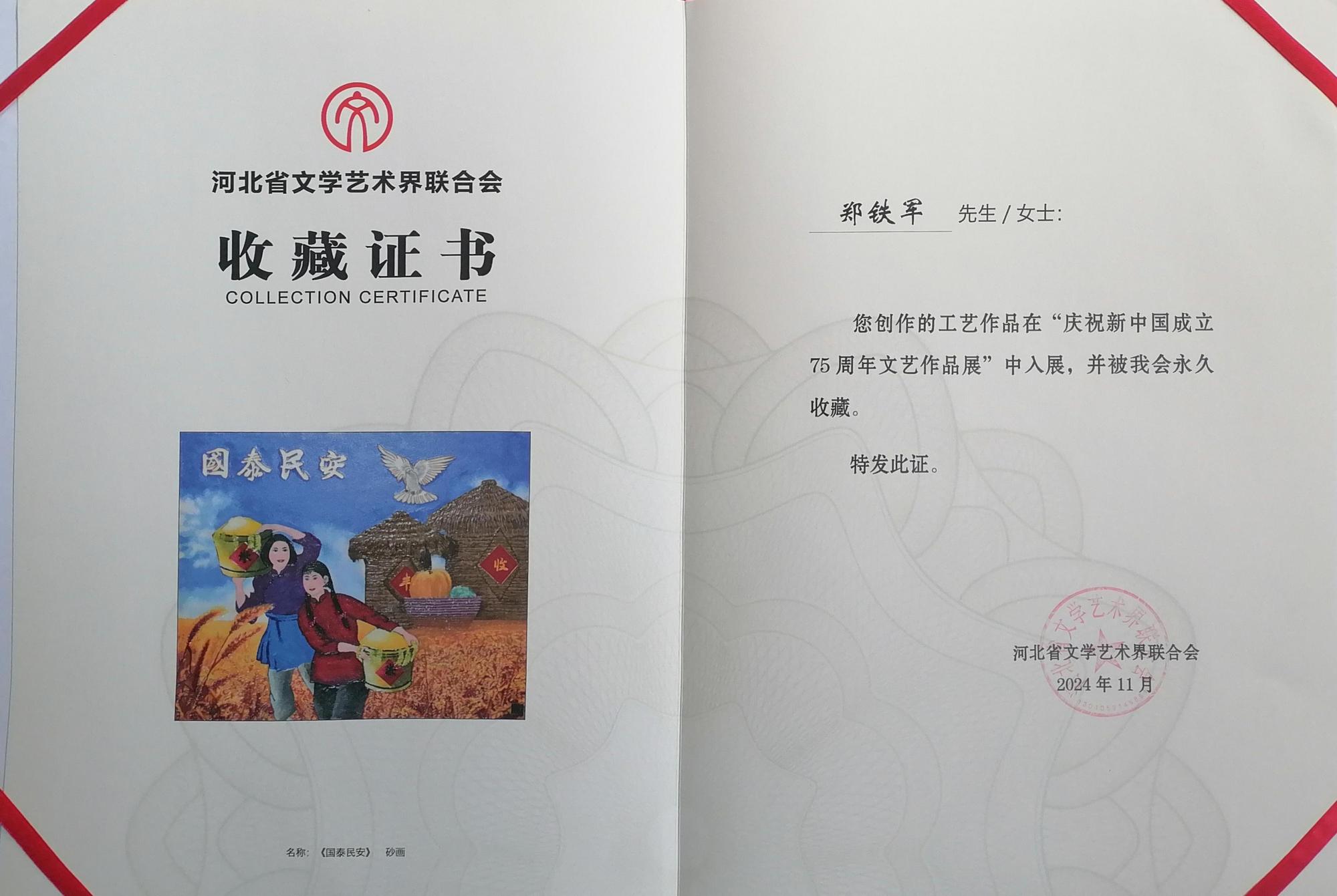 近期,在河北省文學(xué)藝術(shù)界聯(lián)合會舉辦的“慶祝新中國成立75周年文藝創(chuàng)作展”中,由鄭鐵軍創(chuàng)作的《國泰民安》憑借其獨(dú)特的藝術(shù)魅力和深厚的文化底蘊(yùn),被河北省文學(xué)藝術(shù)界聯(lián)合會永久收藏,成為本次展覽的一大亮點(diǎn)。