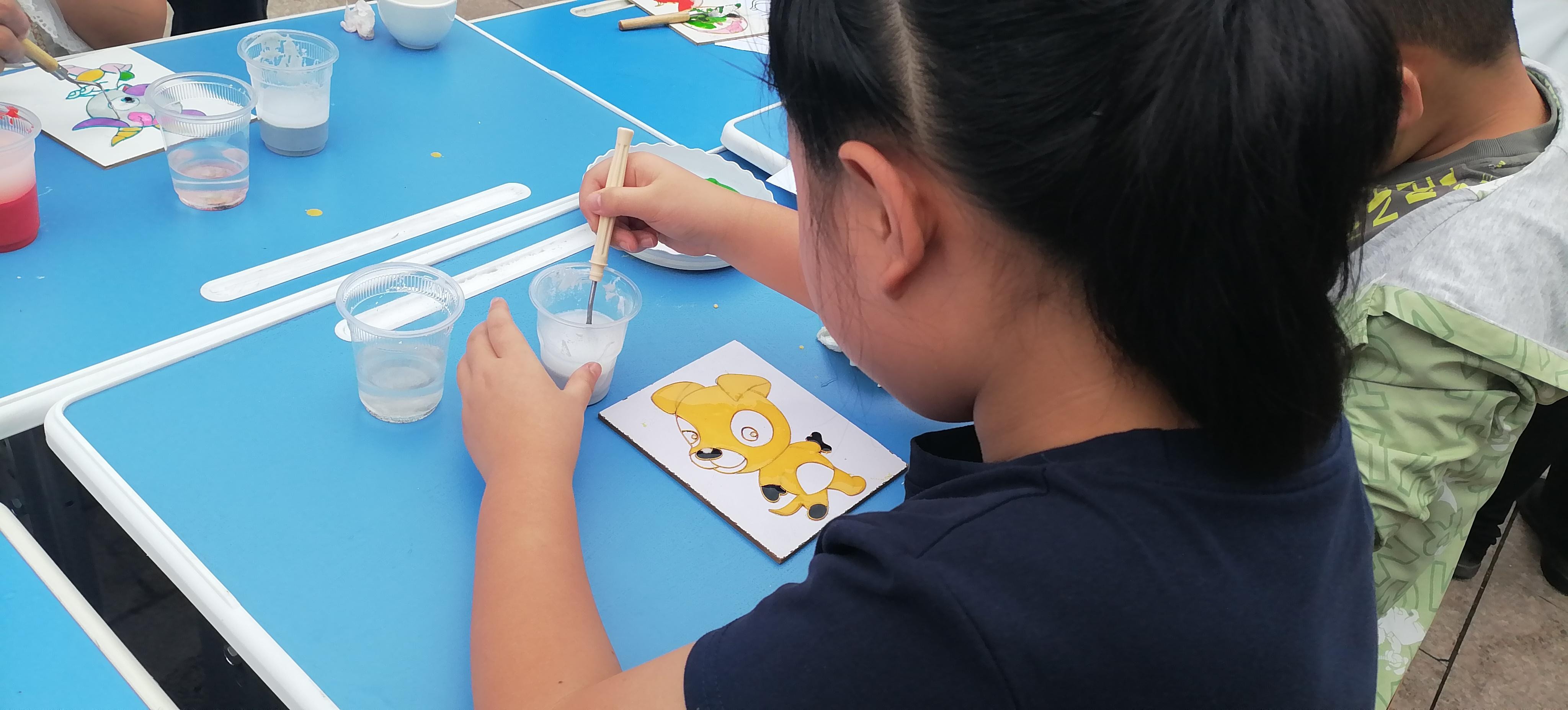 活動(dòng)現(xiàn)場(chǎng),鄭氏砂藝的“天然彩砂+金銀絲”工藝成為孩子們的“興趣焦點(diǎn)”。作為興隆縣的省級(jí)非遺項(xiàng)目,鄭氏砂藝以天然礦物彩砂為原料,采用金絲銀線勾勒?qǐng)D案輪廓,再填充彩砂的傳統(tǒng)手法,既保留了鄉(xiāng)土文化特色,又蘊(yùn)含著非遺技藝的巧思。為讓孩子們輕松參與,技師們特意提前制作了粘好金絲的半成品——一幅幅待填充的砂畫作品,將“最精彩的創(chuàng)作環(huán)節(jié)”留給孩子。“我要給小虎的臉涂綠色!”“我喜歡藍(lán)色的眼睛!”孩子們圍坐桌前,手持作畫小鏟,認(rèn)真地將色彩砂石填入金絲框架,同時(shí)互相交流“配色秘訣”,現(xiàn)場(chǎng)充滿了童真與熱鬧。