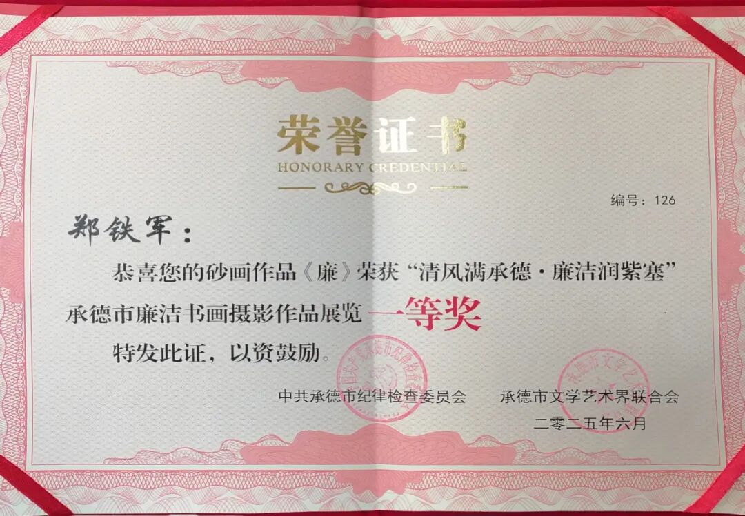 近日,“清風(fēng)滿承德·廉潔潤紫塞”承德市廉潔書畫攝影作品展覽評選結(jié)果揭曉,砂藝創(chuàng)作者鄭鐵軍的作品《廉》榮獲一等獎(jiǎng)。該獎(jiǎng)項(xiàng)由中共承德市紀(jì)律檢查委員會(huì)、承德市文學(xué)藝術(shù)界聯(lián)合會(huì)聯(lián)合頒發(fā)。