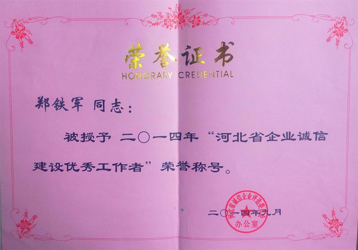 9月26日,河北省誠信企業(yè)評(píng)選委員會(huì)辦公室和河北省企業(yè)家協(xié)會(huì)同省有關(guān)部門通報(bào)表彰“河北省誠信企業(yè)”及“河北省企業(yè)誠信建設(shè)優(yōu)秀工作者”。興隆縣鄭氏砂藝有限公司榮獲“河北省誠信企業(yè)”榮譽(yù)稱號(hào);公司總經(jīng)理鄭鐵軍被授予“河北省誠信企業(yè)建設(shè)優(yōu)秀工作者”榮譽(yù)稱號(hào)。“河北省誠信企業(yè)”及“河北省企業(yè)誠信建設(shè)優(yōu)秀工作者”評(píng)選活動(dòng)每兩年組織開展一次。2014年,經(jīng)過公司申報(bào)、基層相關(guān)部門審查推薦、省相關(guān)主管部門復(fù)審、評(píng)審專家委員會(huì)審核評(píng)選、社會(huì)公示等程序獲此稱號(hào)。這是公司首次獲此殊榮。