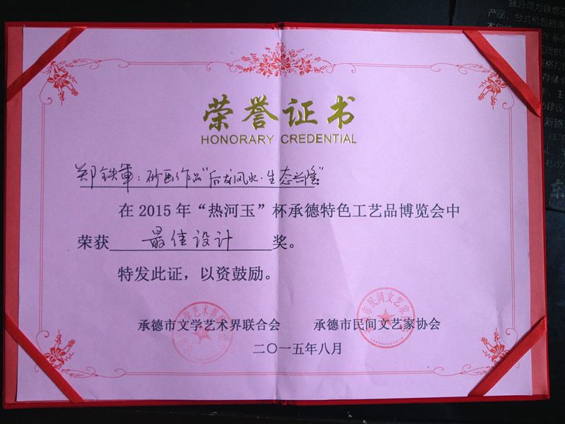 2015年8月,承德市文學(xué)藝術(shù)界聯(lián)合會和承德市民間文藝家協(xié)會舉辦了,2015年“熱河玉”杯承德特色工藝品博覽會,鄭氏砂藝文化有限公司總經(jīng)理鄭鐵軍的砂畫作品“后龍風(fēng)水 生態(tài)興隆”榮獲《最佳設(shè)計獎》。